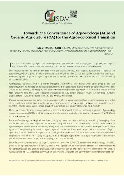 Il 'agit du résumé de la locution du Directeur Exécutif du GSDM, à EAAC 2025 (2nd Eastern Africa Agroecology Conference). Il a représenté le GSDM ainsi que le SYMABIO, au cours de cette édition, qui s'est déroulé à Nairobi, Kenya. Il présente l'Agroécologie et l'Agriculture Biologique comme deux ensembles naturellement lié et dont la synergie favorise la transition agroécologique. Ce document contient ainsi le résumé de son élocution, en version française et anglaise.